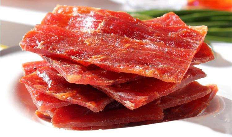 豬肉烘干:烘干的目的主要是促進(jìn)發(fā)色和脫水熟化。將鋪平在篩子上的已連成一大張的肉片放入烘干房中,烘干的溫度在55~60℃,前期烘干溫度可稍高。